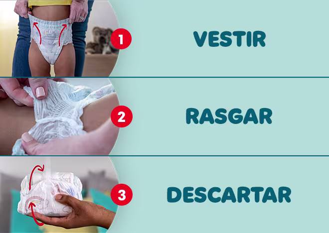 Enrole e feche a fralda com a fita adesiva da parte de trás, e descarte